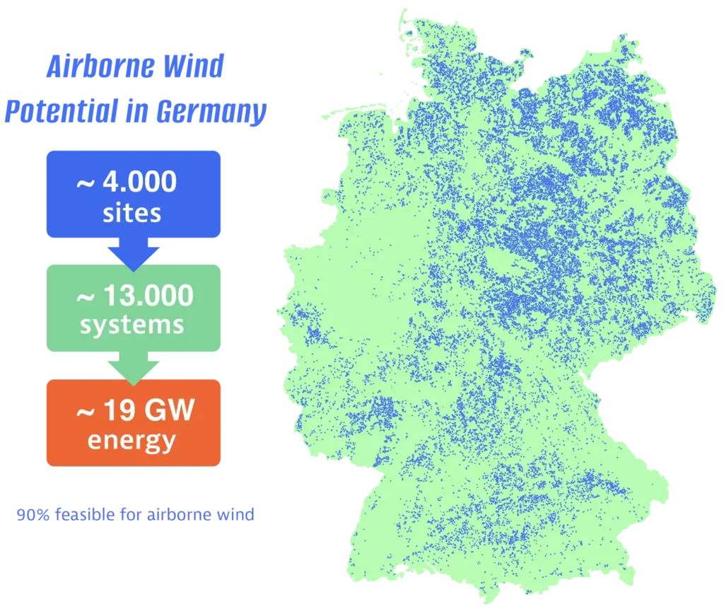 According to BlueWise Marine’s 2023 GIS analysis, around 4,000 suitable sites were identified in Germany where roughly 13,000 airborne wind energy systems could be installed—equivalent to about 19 GW of technically deployable capacity, more than 90 % of it on land unavailable to conventional wind turbines.